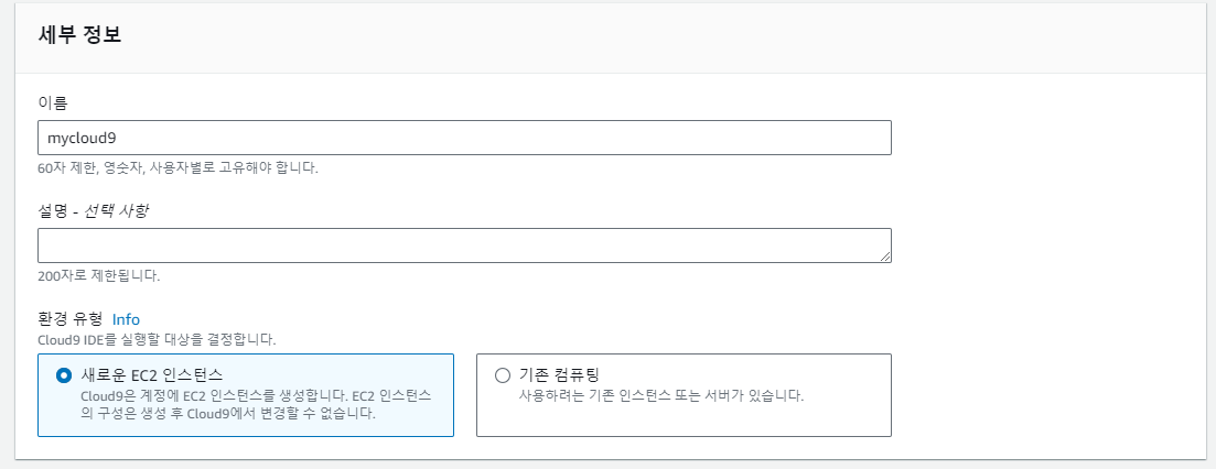 Cloud9 제품에 들어가서 이름을 선택하고 EC2로 서버를 새로 만든다.