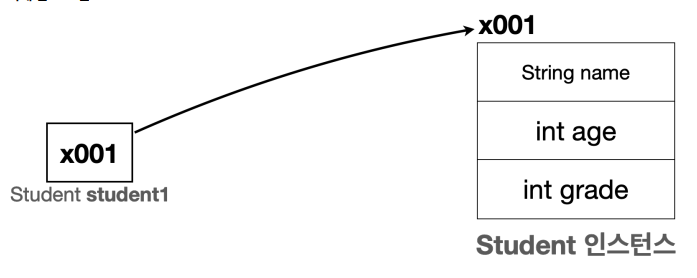 즉, 아래 구문은 객체를 생성하여 해당 메모리 참조값(주소)을 student1 에 저장하는 것이지, 해당 객체를 저장하는것이 아니다. 실제로는 객체를 생성하면 객체는 메모리에 어딘가에 생성이 되고 그 해당 참조값을 student1 에 저장하고 student1 에 접근하면 메모리에 있는 객체에 접근하여 사용하는것이다.