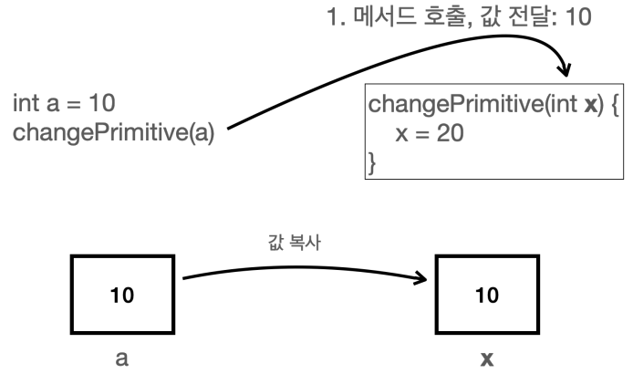 - 기본형, 참조형 모두 항상 변수에 있는 값을 복사해서 대입한다. 기본형이면 변수에 들어 있는 실제 사용하는 값을 복사해서 대입하고, 참조형은 변수에 있는 참조값을 복사해서 대입한다.