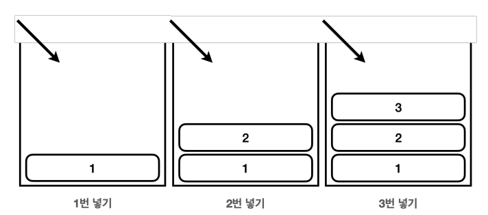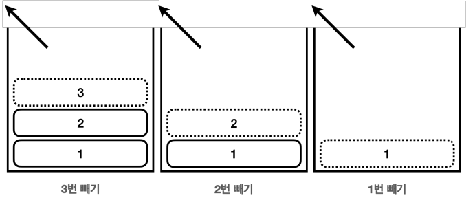 후입 선출(LIFO, Last In First Out) 여기서 가장 마지막에 넣은 3번이 가장 먼저 나온다. 이렇게 나중에 넣은 것이 가장 먼저 나오는 것을 후입 선출이라 하 고, 이런 자료 구조를 스택이라 한다