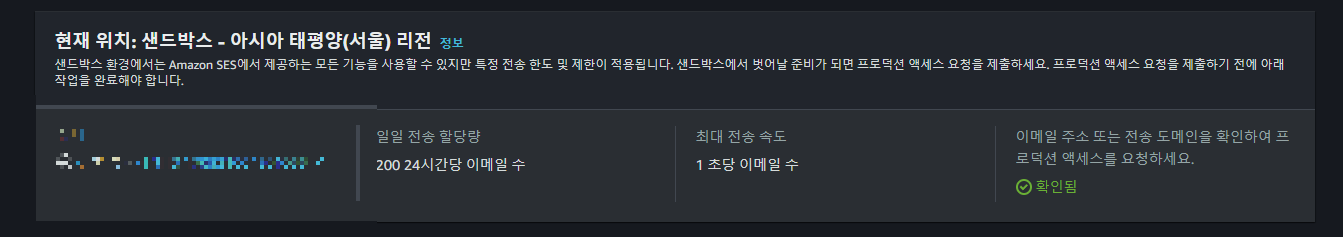 - 이런식으로 뜨게 됩니다. 하지만 저는 AWS 에 있는 고객센터에 승인을 해줘야 가능하다고 해서 문의를 따로 남겨놔서 모자이크 처리 하였습니다. 이제 IAM 작업과 Spring 작업만 하면 됩니다!