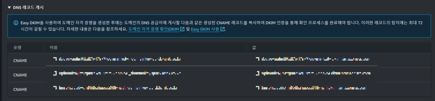 - 그러면 위와 같이 3개의 CNAME 의 유형인 Name, Value 값이 나오게 됩니다.