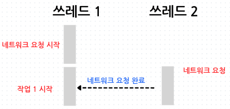 - 쓰레드 1에서 네트워크 요청을 보냅니다. 해당 작업이 완료가 될 때까지 쓰레드 1은 블로킹 상태에 있습니다.