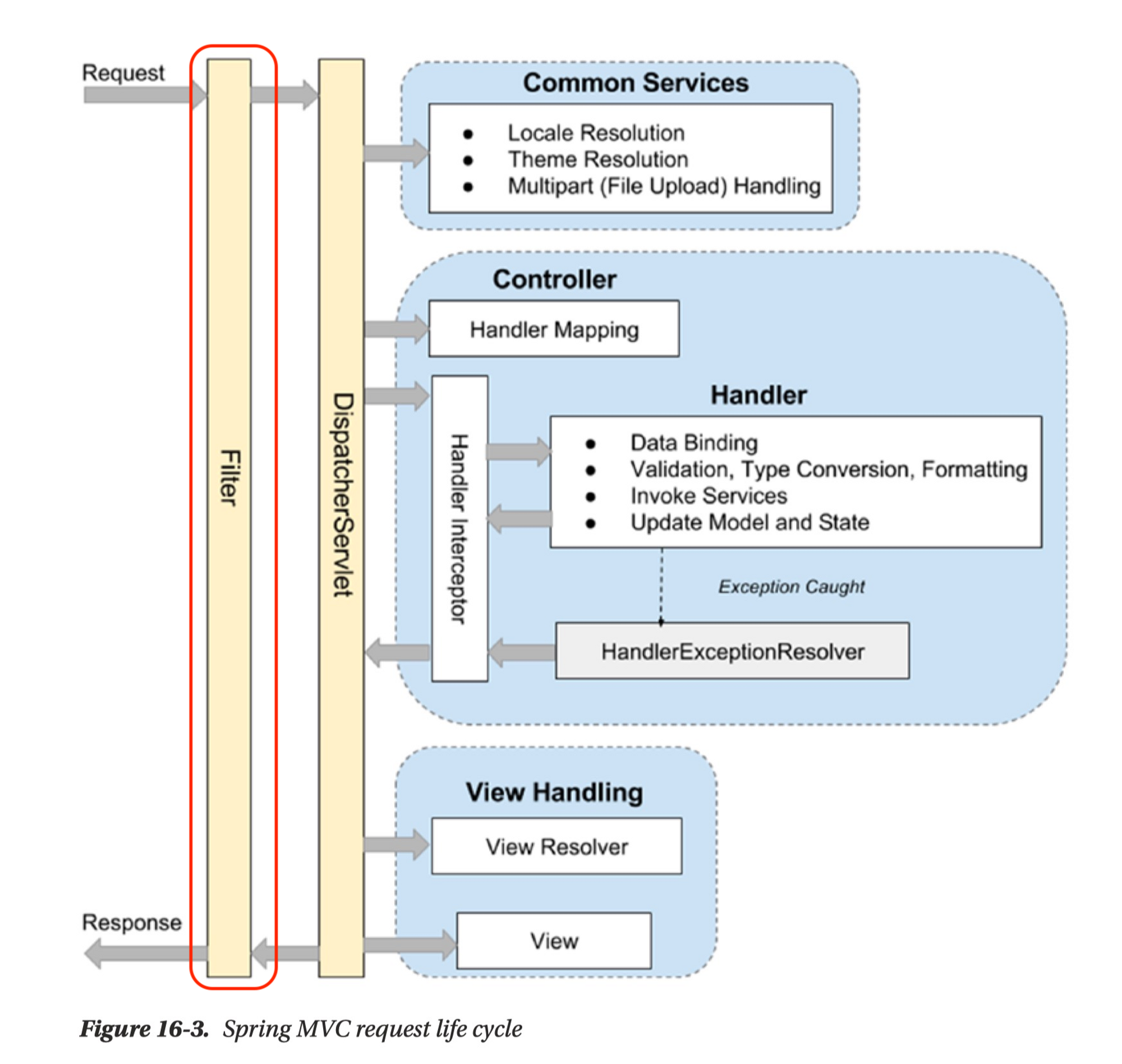 * Spring 에서 모든 호출은 DispatcherServlet 을 통과하게 되고 이후에 각 요청을 담당하는 Controller 로 분배